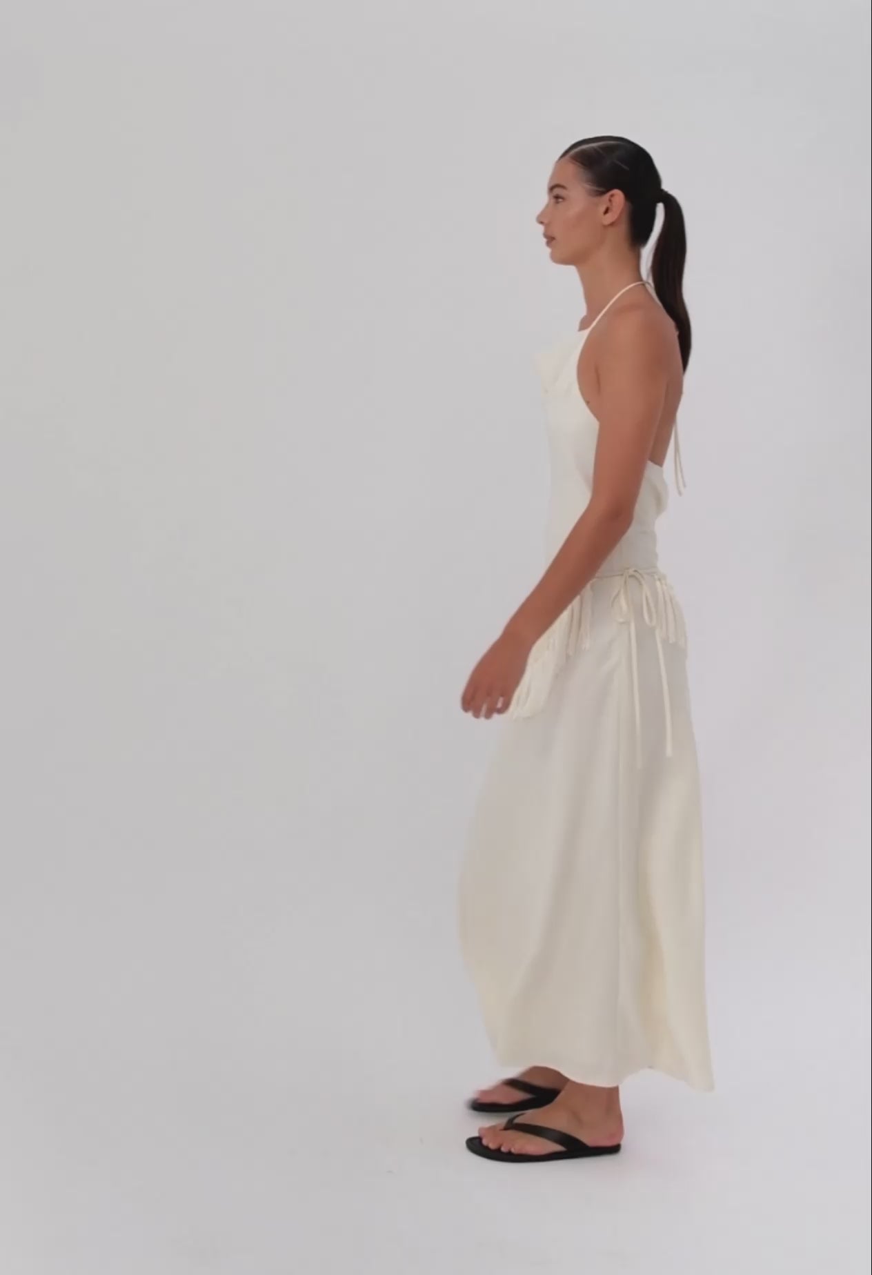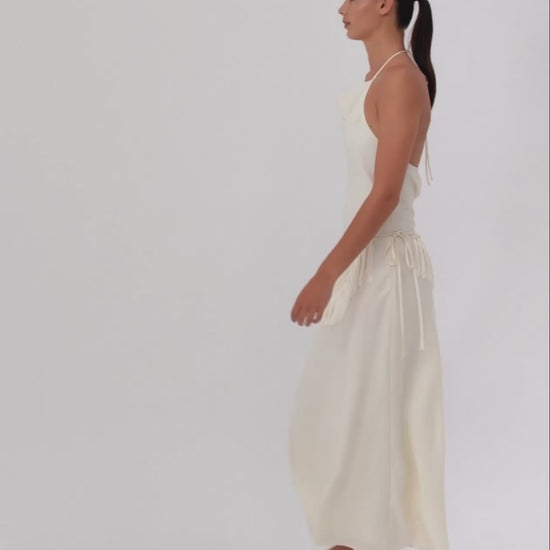 A lustrous bias-cut midi dress forms the base, defined by a soft cowl neckline and fine halter ties that frame the shoulders with restraint. Layered with a coordinating, handcrafted macramé hip wrap, the silhouette gains depth and quiet complexity without losing its purity.